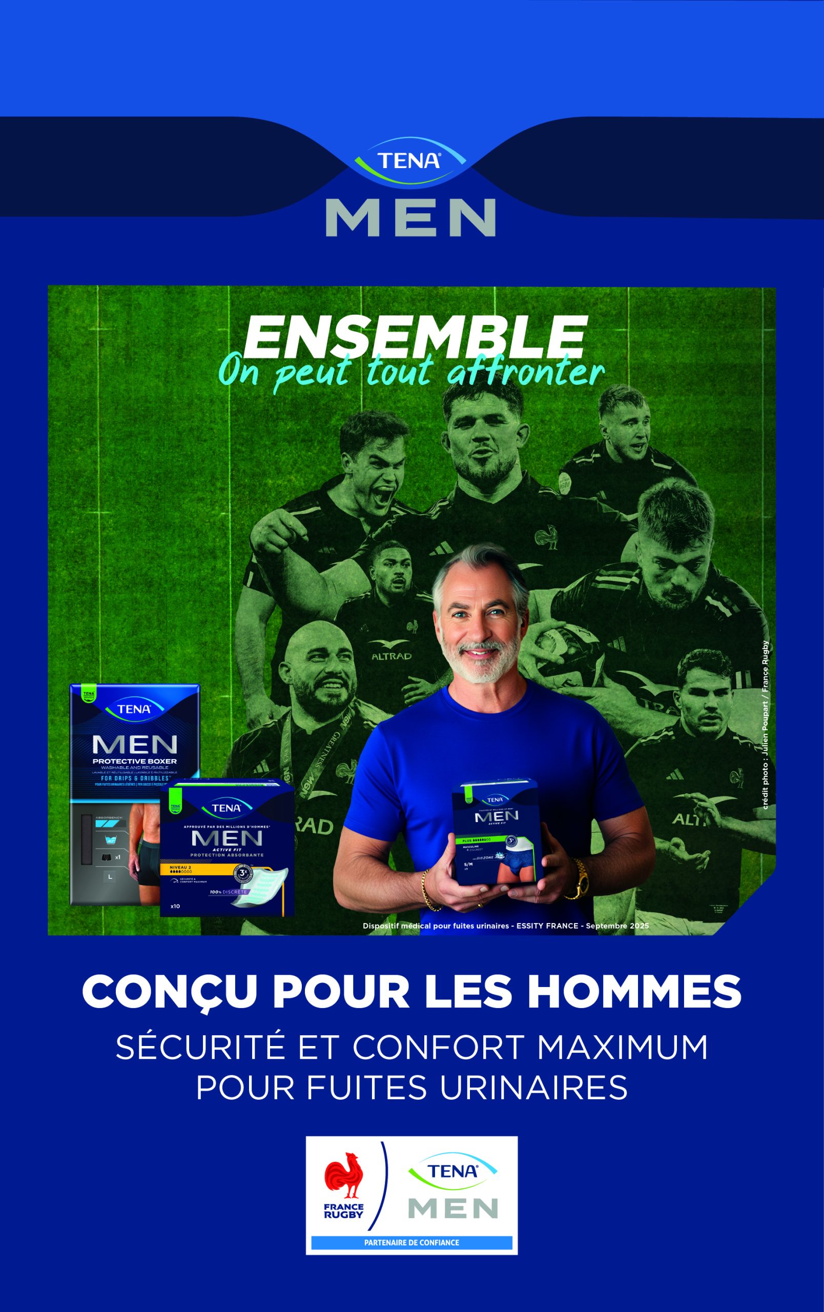 « En nous associant à la Fédération Française de Rugby, nous voulons montrer que les hommes concernés par les fuites urinaires peuvent continuer à vivre pleinement, à pratiquer du sport, et à rester dans le match,» explique Cerise Prat, Directrice Marketing du groupe. « Ce partenariat s’inscrit pleinement dans notre volonté d’aborder avec authenticité et responsabilité des sujets de société qui peuvent toucher tout le monde,» indique de son côté Jean-Marc Lhermet, Vice-Président de la FFR. L’opération commerciale a été orchestrée par les agences Publicis Sport et Infront.