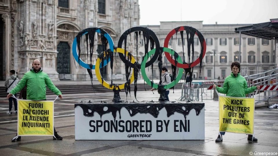Selon un communiqué de Greenpeace, les émissions de gaz à effet de serre du groupe énergétique menacent la saison froide, la neige et les sports d’hiver. L’organisation demande au Comité international olympique (CIO) de rompre les partenariats avec les entreprises de pétrole et de gaz, à commencer par Eni. La campagne s’inscrit dans une mobilisation plus large contre le sponsoring des combustibles fossiles dans le sport, pointée comme contradictoire avec les valeurs environnementales des Jeux.